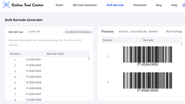 Vytvořte více čárových kódů hromadně z Excelu nebo CSV. Zdarma online generátor více čárových kódů podporující kód 128, EAN-13, UPC-A a export formáty připravené k tisku.